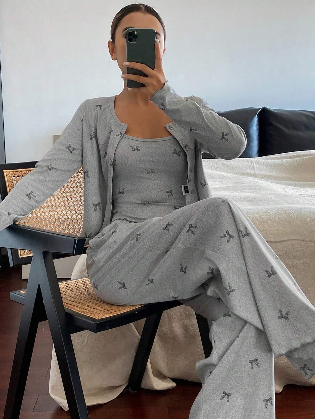 3 pezzi Set pigiama da donna con top a canottiera, pantaloni e top con bottoni, con stampa a fiocco all-over, per autunno e inverno