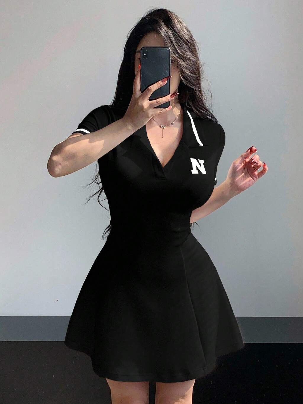Maglietta casual da donna con colletto polo, maniche corte e ricamo a contrasto