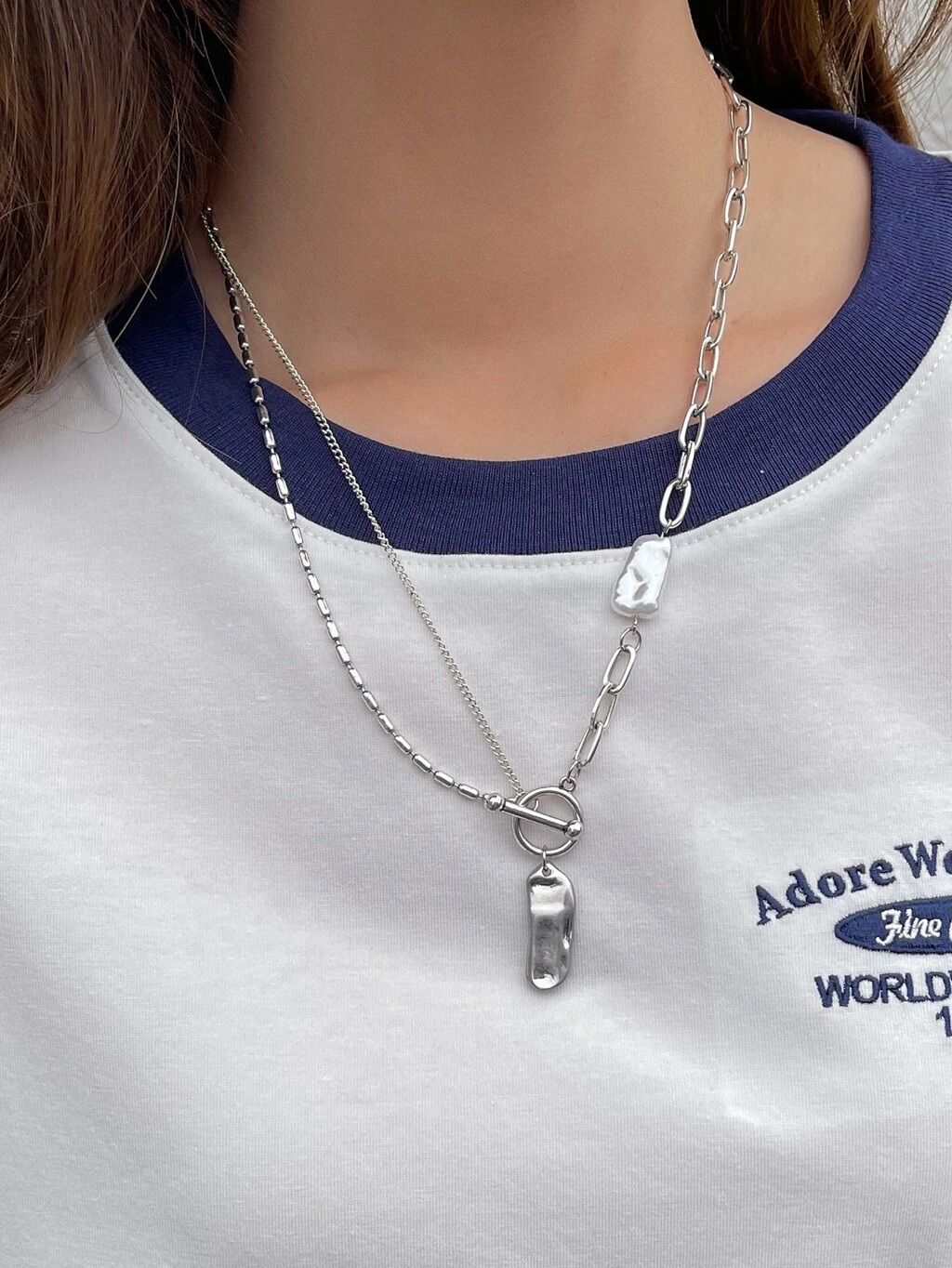 Collana multifila con ciondolo rettangolare asimmetrico decorato con perle finte