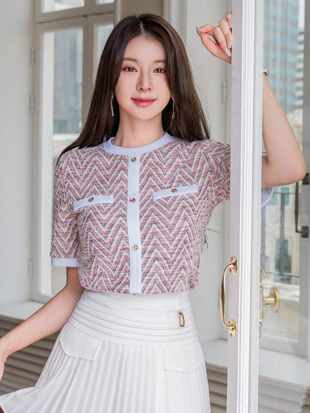 Elegante maglietta con scollo tondo a maniche corte, in disegno a spina di pesce, adatta per l'ufficio e per l'estate di San Valentino