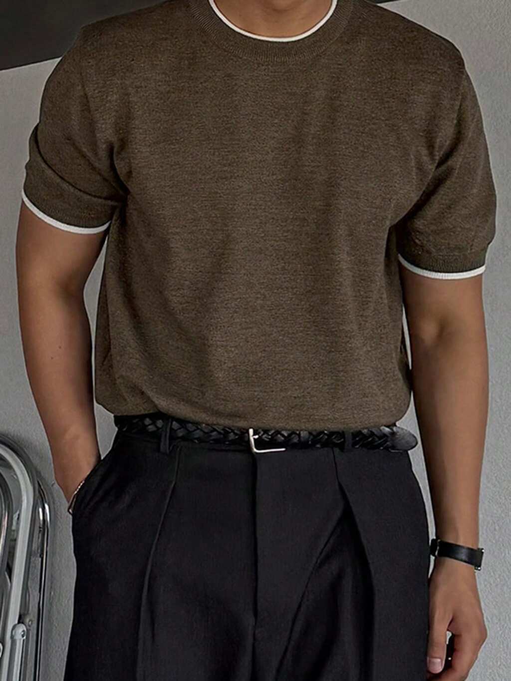 メンズ ソリッドカラー クルーネック ブラウン ニットセーター 夏用