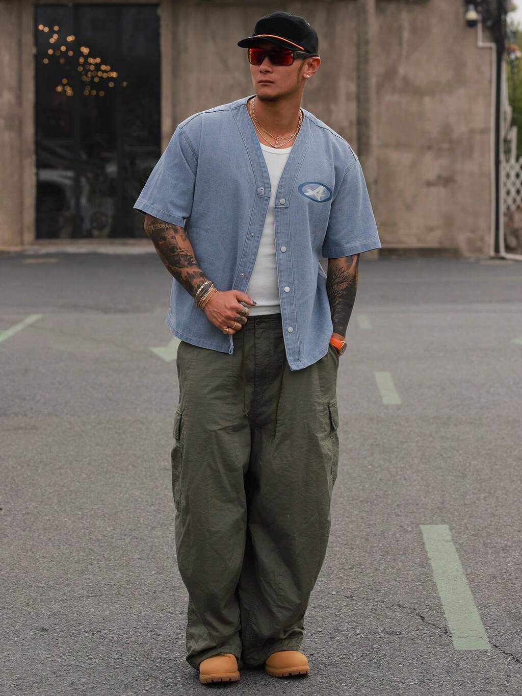 メンズ レタープリント 半袖 ウォッシュデニムジャケット、夏用