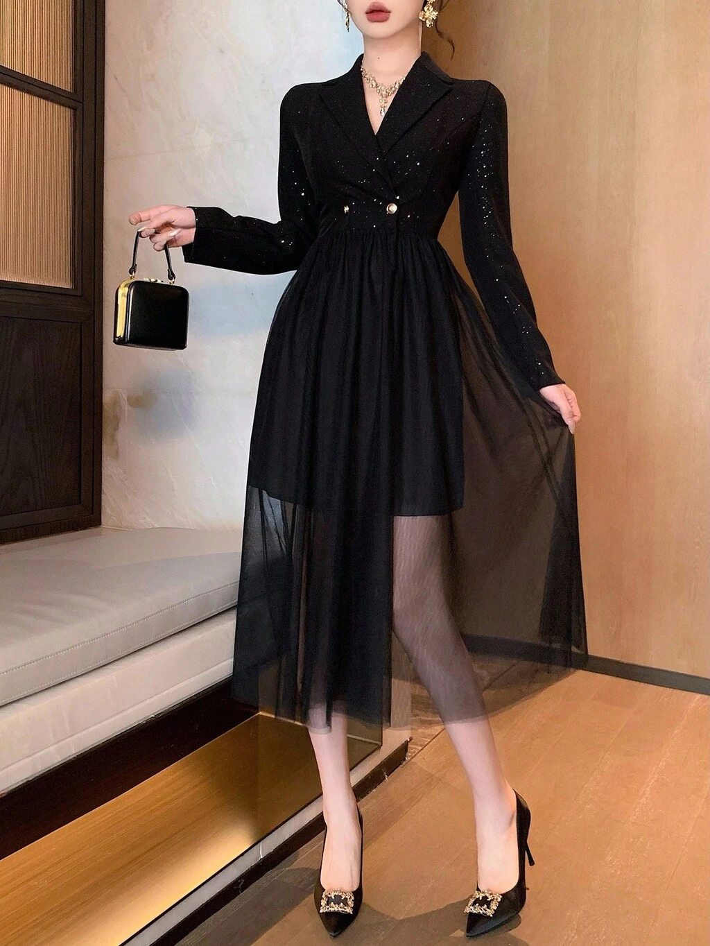 メッシュパッチワーク ブレザーカラー エレガントパーティードレス、ミドル丈ドレス、秋ドレス