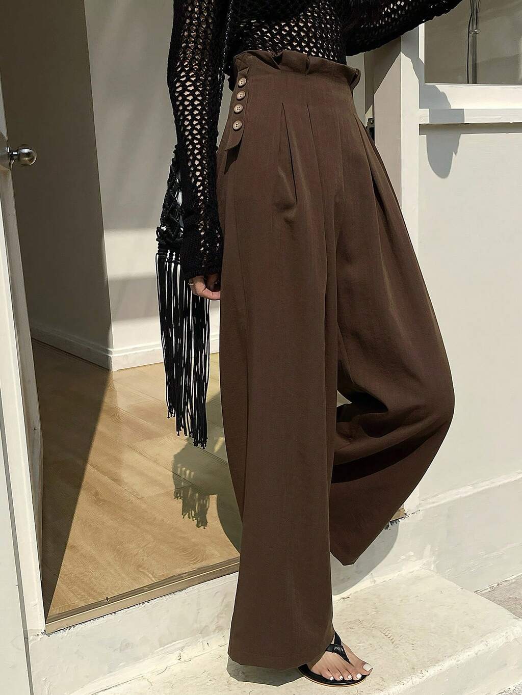 女性用ボタンプリーツ ワイドレッグ ストレート カジュアル 無地パンツ、ファッション、女性のドレスパンツ