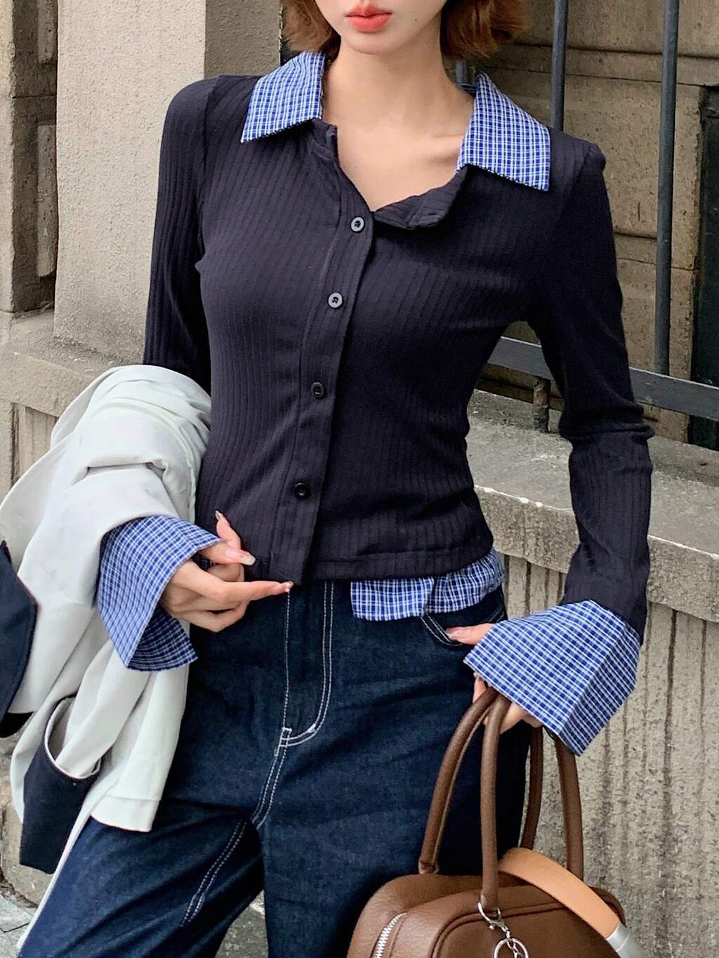 レディース コントラストカラー襟 チェック柄パッチワーク スリムフィット 長袖カジュアルTシャツ