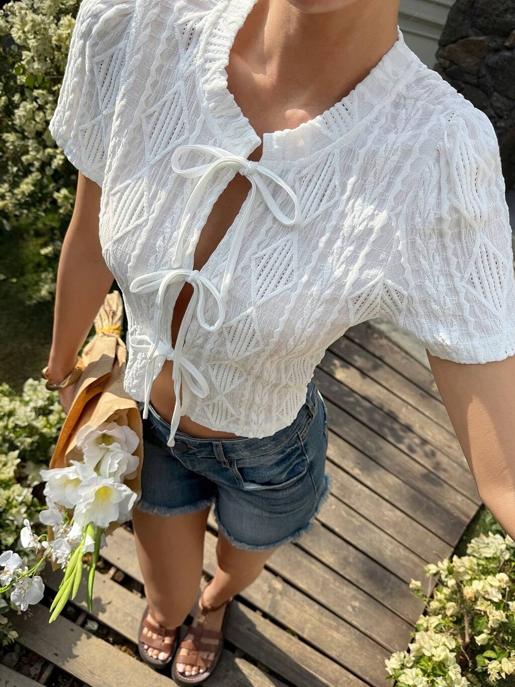 女性用 ラウンドネック 半袖 テクスチャ生地 リボンタイ カジュアル シック ブラウス