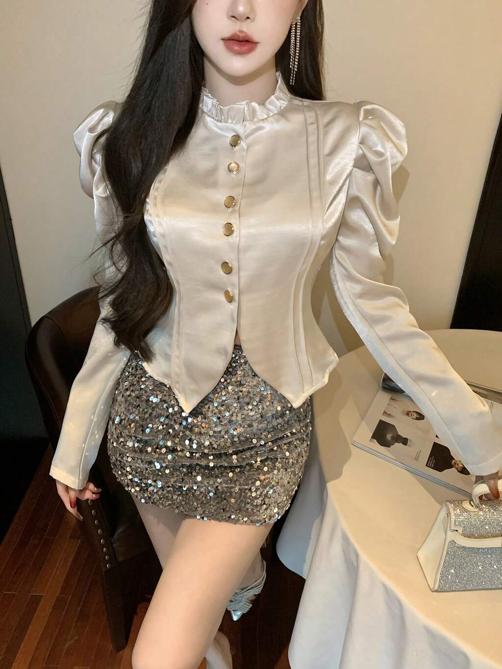 無地スタンドカラー フリル付き パフスリーブ レディースブラウス、秋冬レディースウェア 長袖トップス