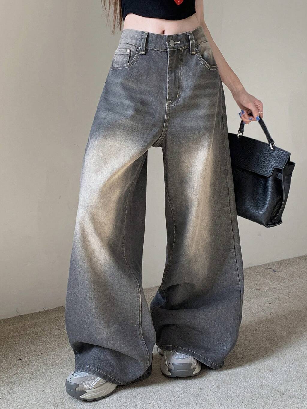 ウィメンズ ルーズフィット パッチワーク ワイドレッグ ウォッシュドデニムジーンズ、韓国スタイル、バギージーンズ 秋冬