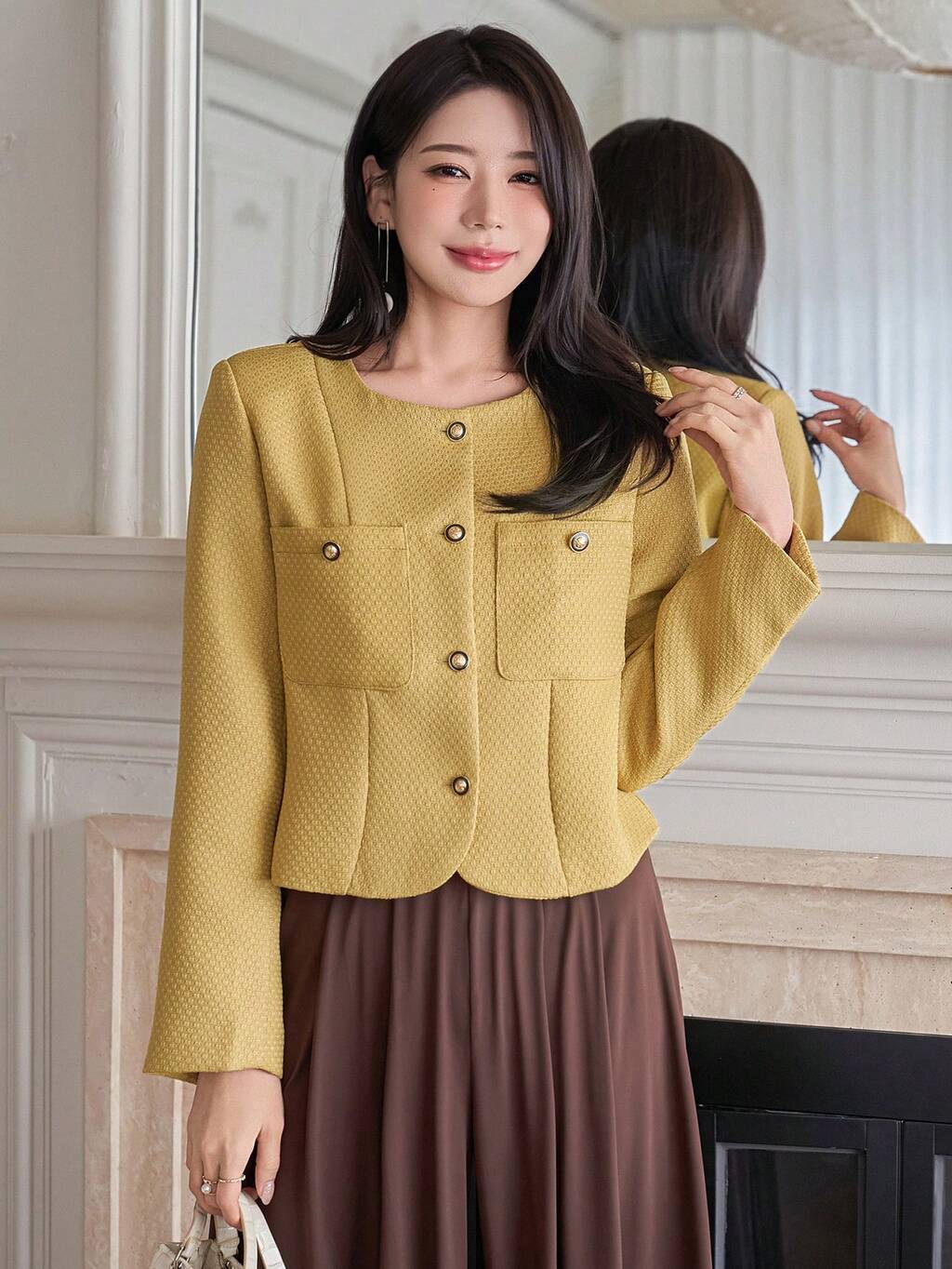 女性用エレガントなプレーンテクスチャーラウンドネックポケット付き定番ジャケット、春向け