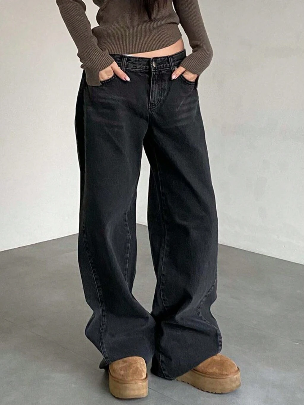 ウィメンズ ルーズ ストレートレッグ ロング ストリートスタイル バギージーンズ ローライズジーンズ