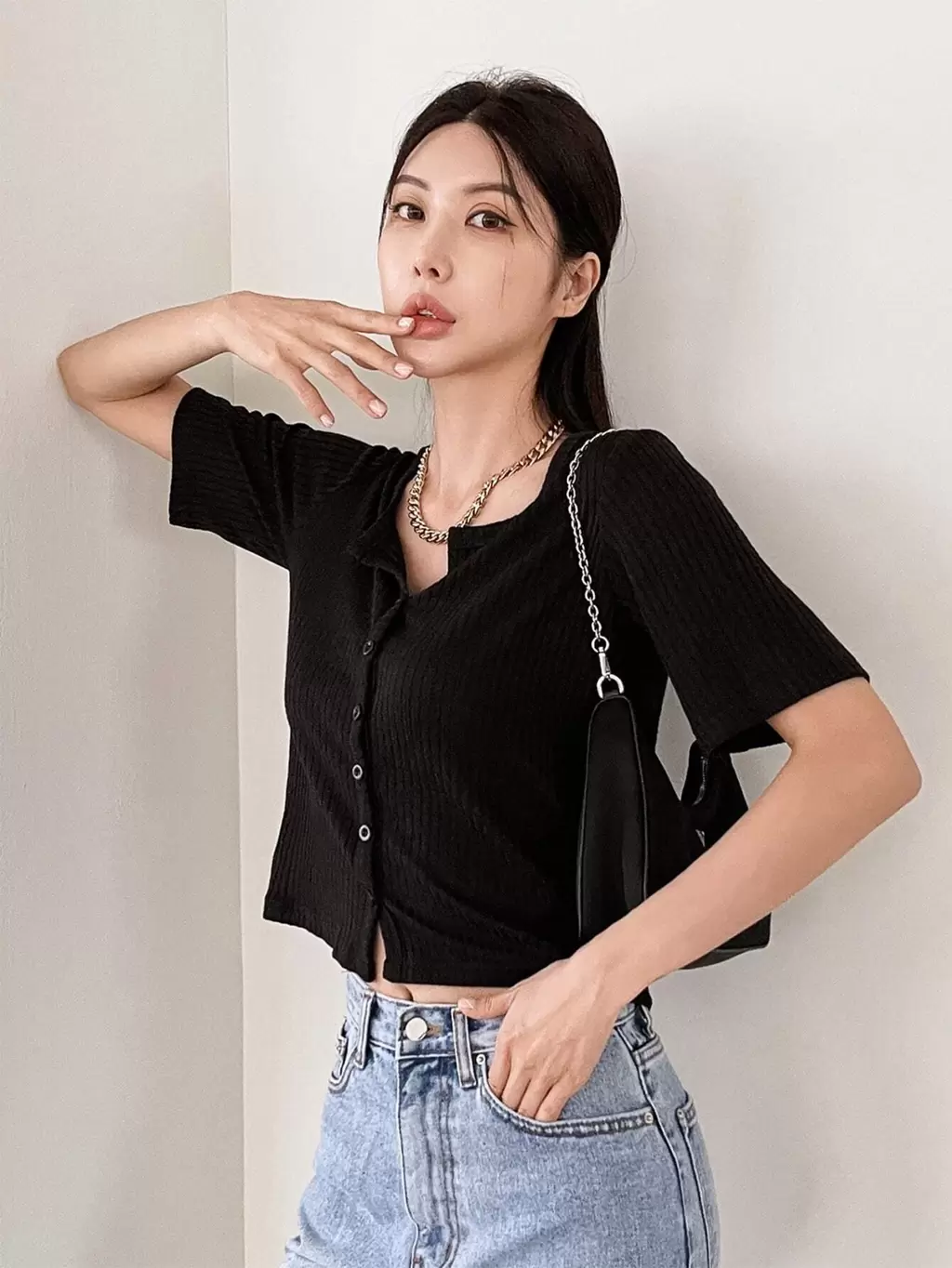 リブニットクロップTシャツ ソリッド プレッピースタイル