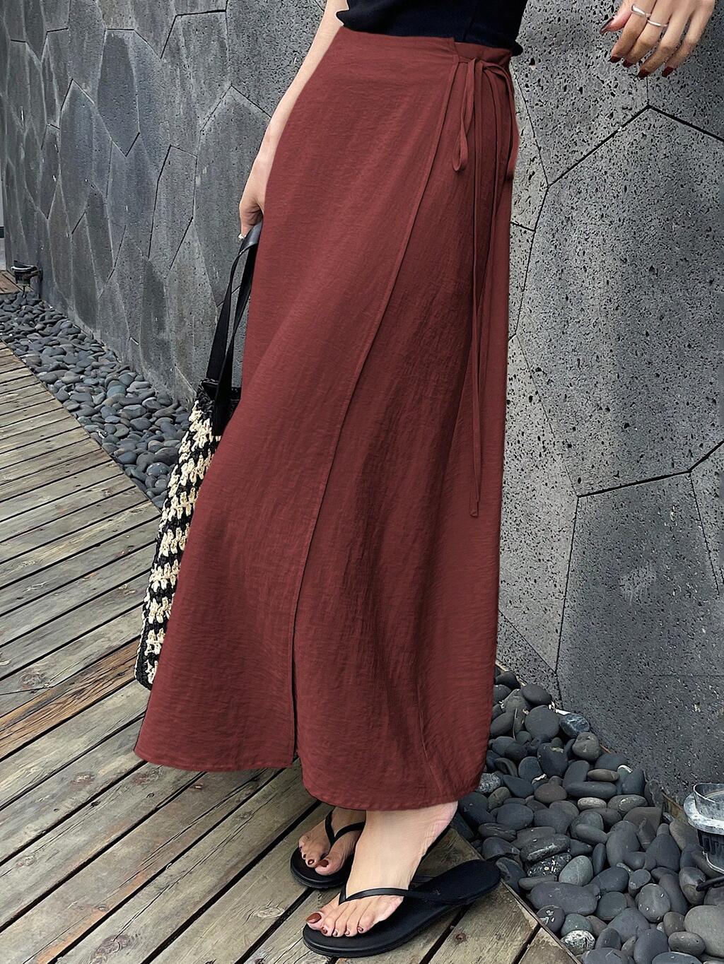 女性用無地レースアップカジュアルロングラップスカート、夏の女性服、夏服、夏の仕事着、リネン素材 ロングスカート