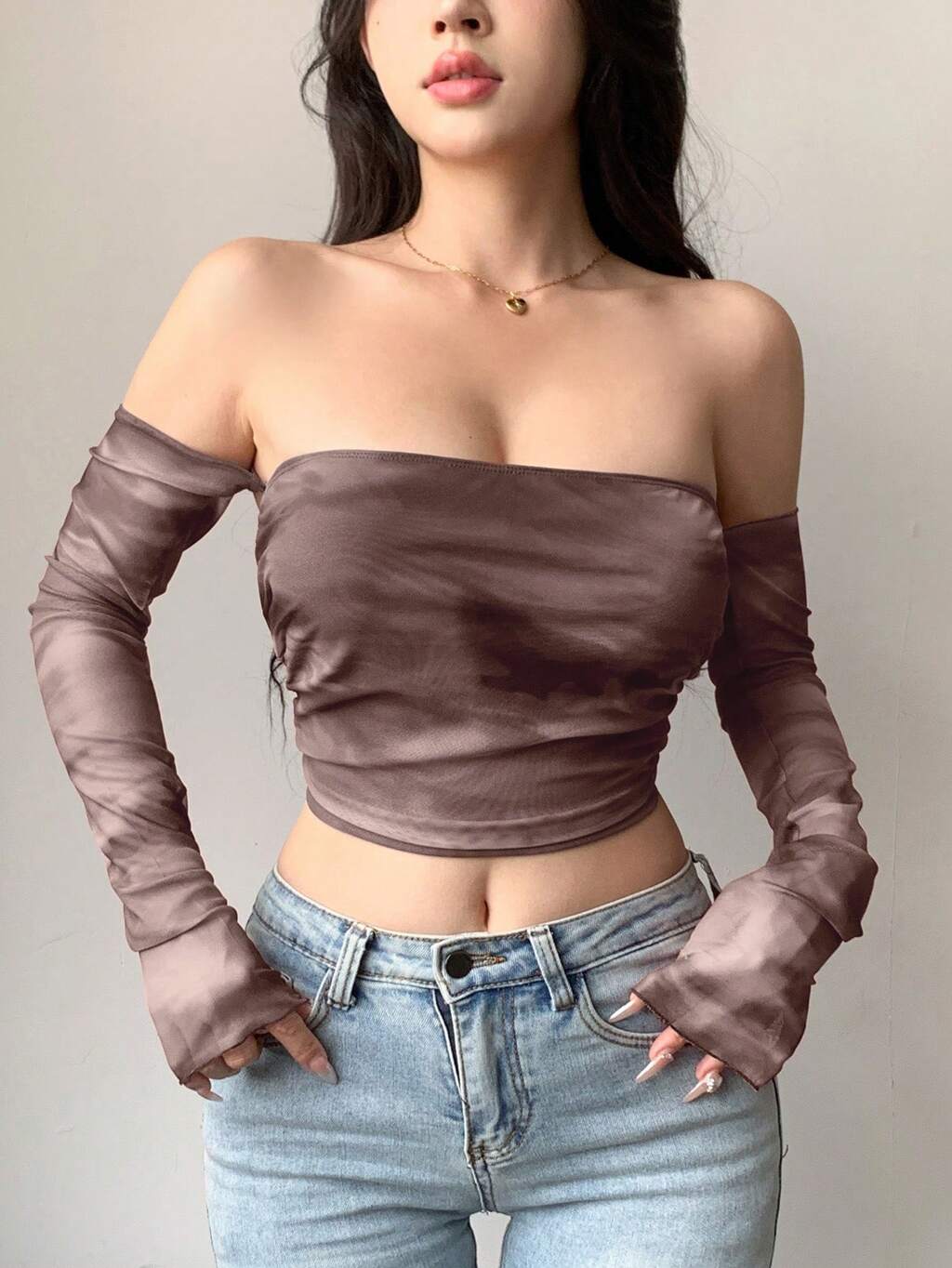 タイダイ シアーメッシュ クロップド オフショルダー 長袖 レディーストップス お出かけ用 フェスティバル 夏、オフショルダートップス、学校再開の服装
