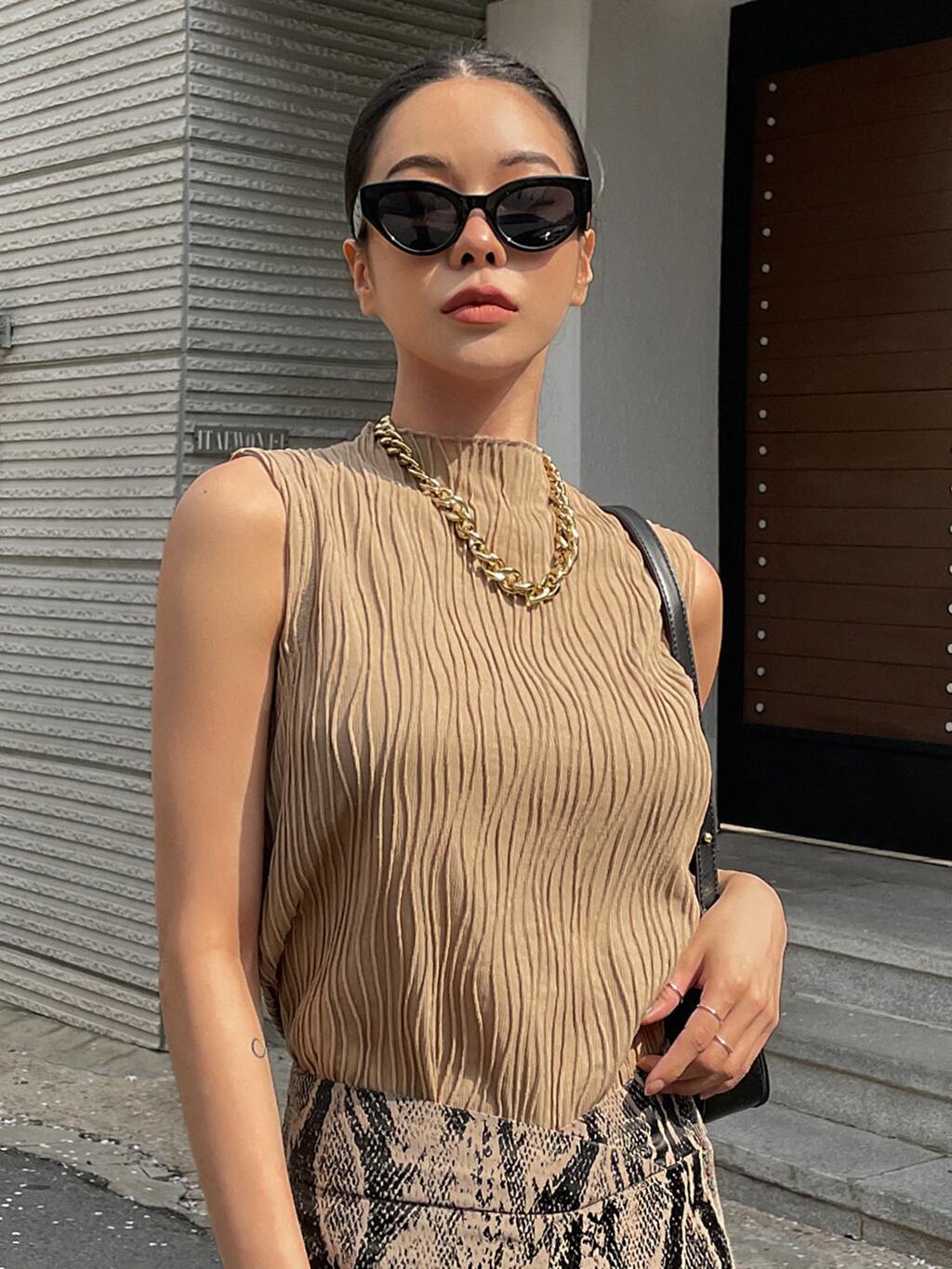 レディース プレーン スタンドカラー テクスチャー カジュアル ファッション タンクトップ サマー、ノースリーブ