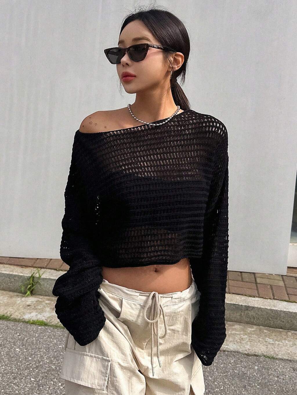 無地ラウンドネック シースルー 長袖 カジュアルセーター プルオーバー シアー、秋の女性服 ニットトップス