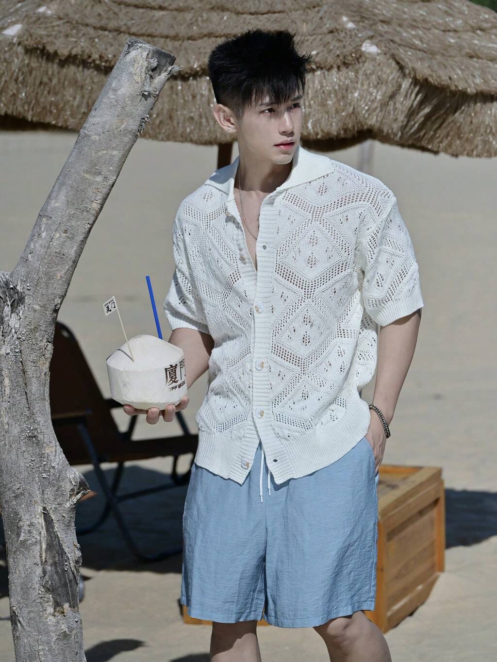 여름 질감 트위스트 케이블 메쉬 블루 반팔 남성 니트 상의