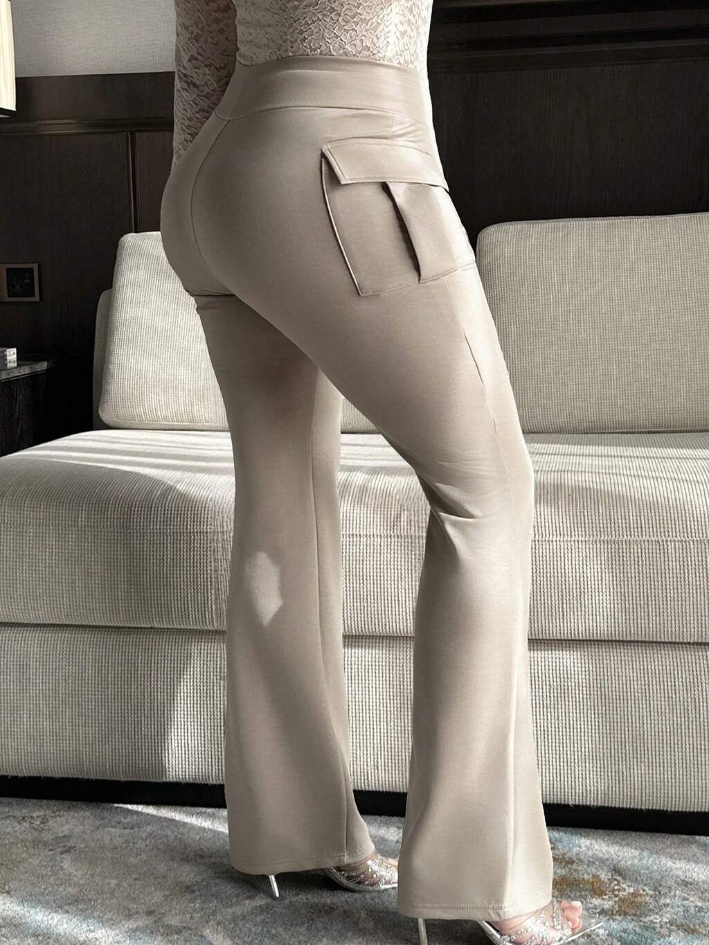 Dazy Plus 신축성 있는 옆면 포켓 플레어 레그 발목 길이 블랙 바지, 올 시즌