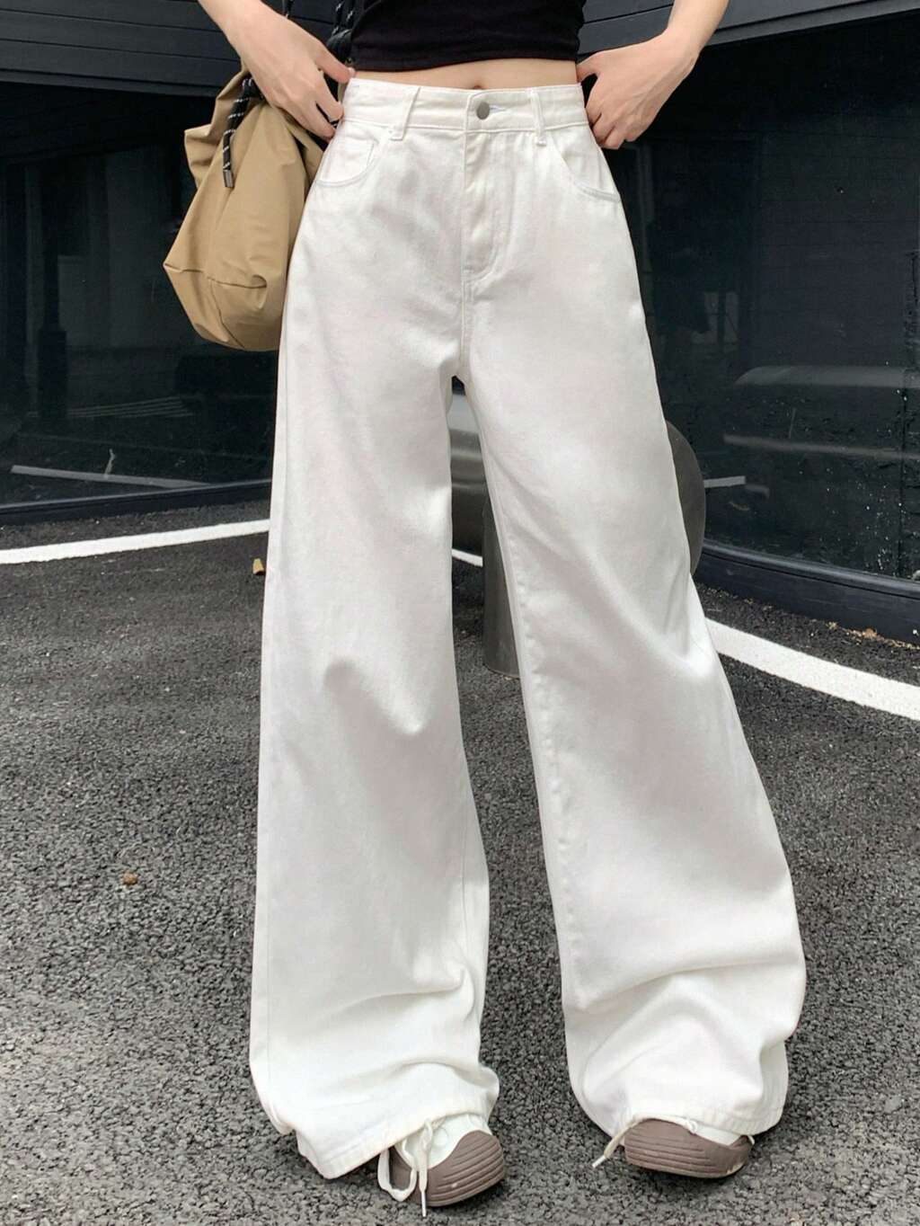 여성 캐주얼 솔리드 화이트 포켓 워싱 와이드 레그 진, 봄/여름