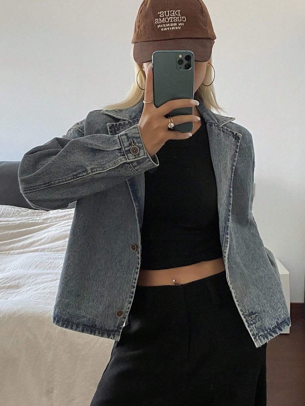 Pointed Collar Single-Breasted Washed Denim Jacket,Back To School Clothes
