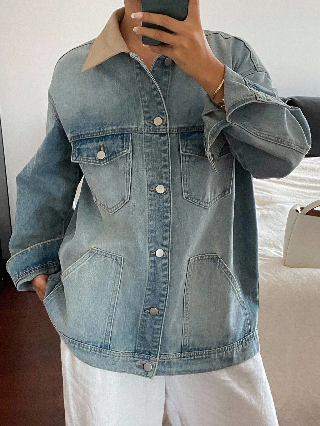 Women's Loose Casual Street Style Patchwork Contrast Color Regular Denim Jacket, Autumn/Winter