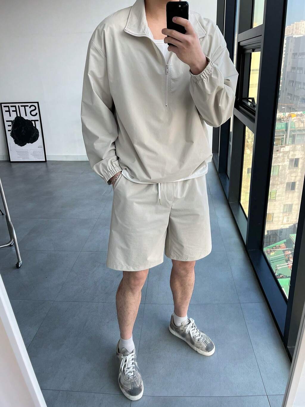 Men's Solid Color Polo Collar Zip-Up Long Sleeve Sweatshirt And Drawstring Waist Pocket Shorts Casual Outfit, Spring/Summer