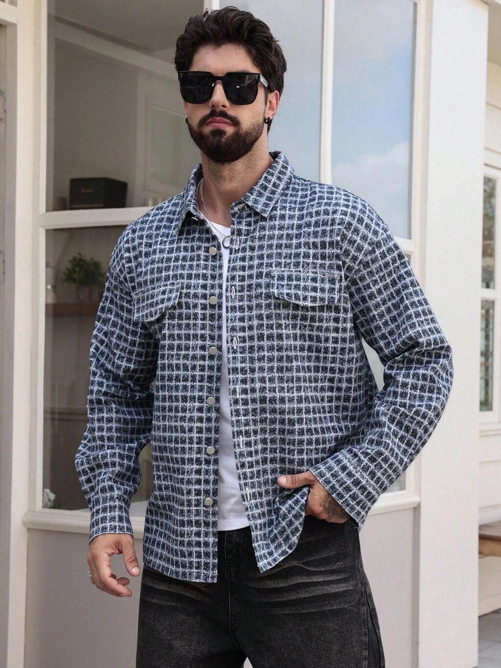 Men's Plaid Blue Denim Effect Shacket, Autumn Jacket