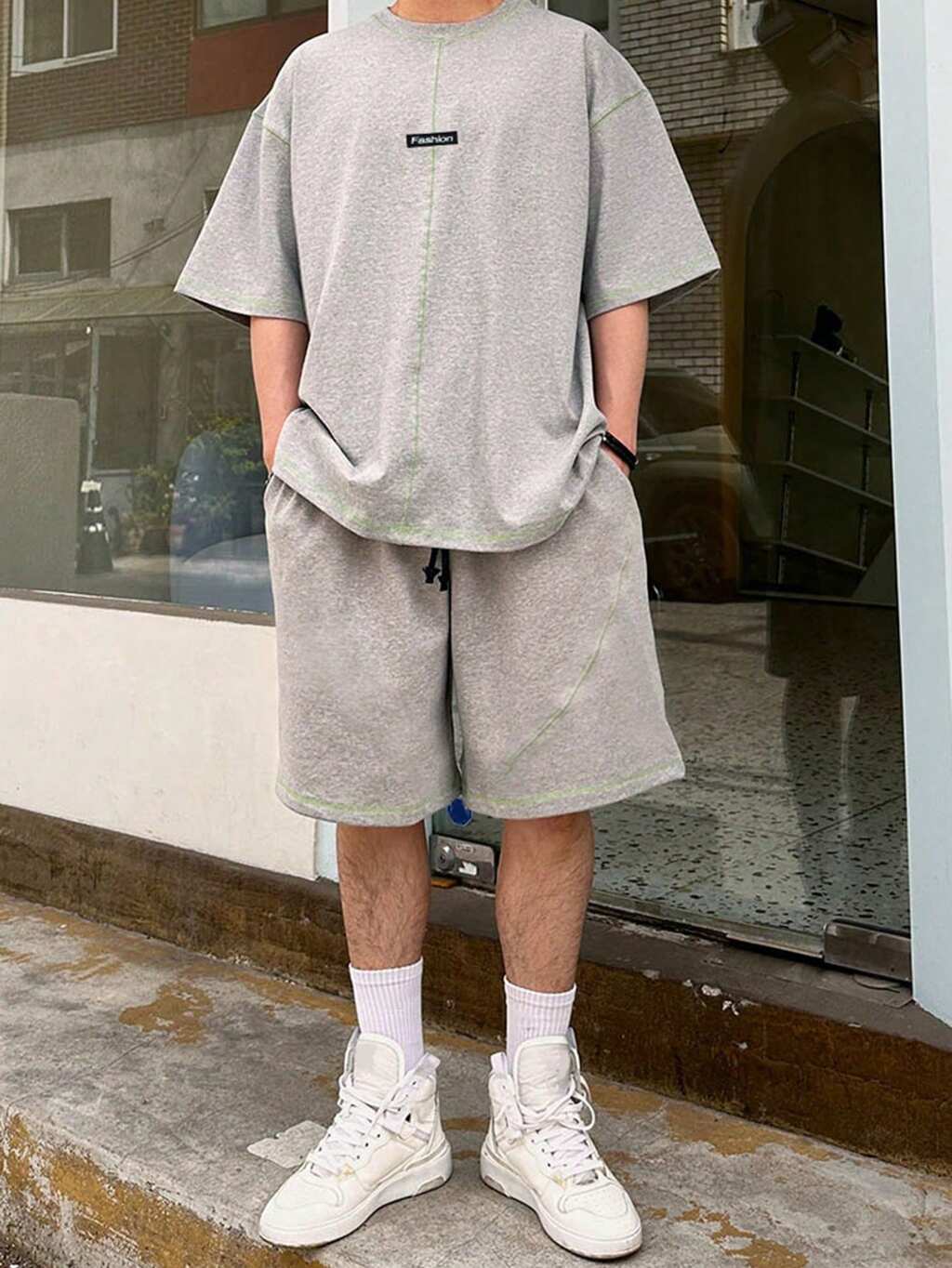 Men's Grey Graphic T-Shirt Set With Decorative Lines, Summer