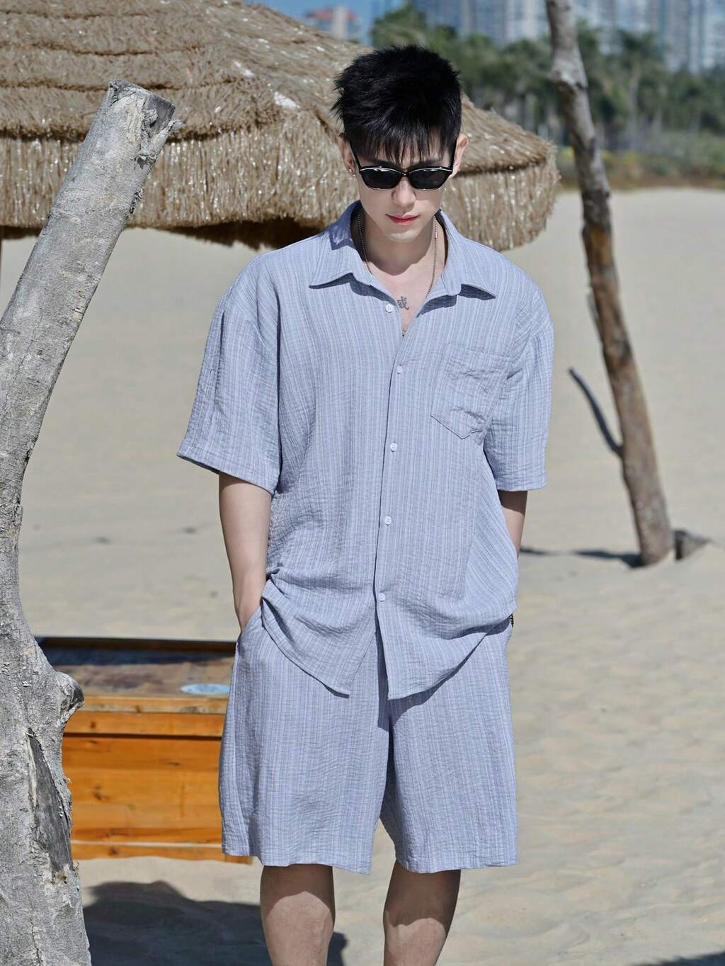 Men's Solid Blue Textured Striped Fabric Short Sleeve Shirt And Shorts Set, Summer