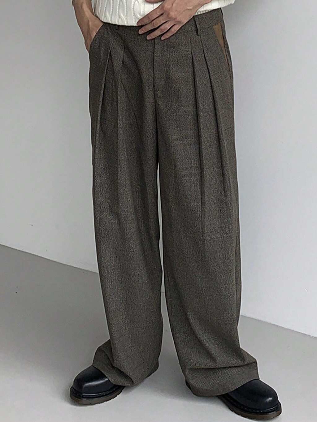 Men's Autumn Elastic Waist Pleated Design Loose Fit Dark Grey Suit Pants