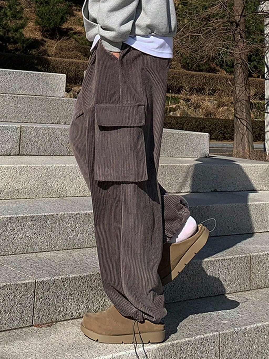 Men's Solid Brown Pants With Large Pockets, Autumn