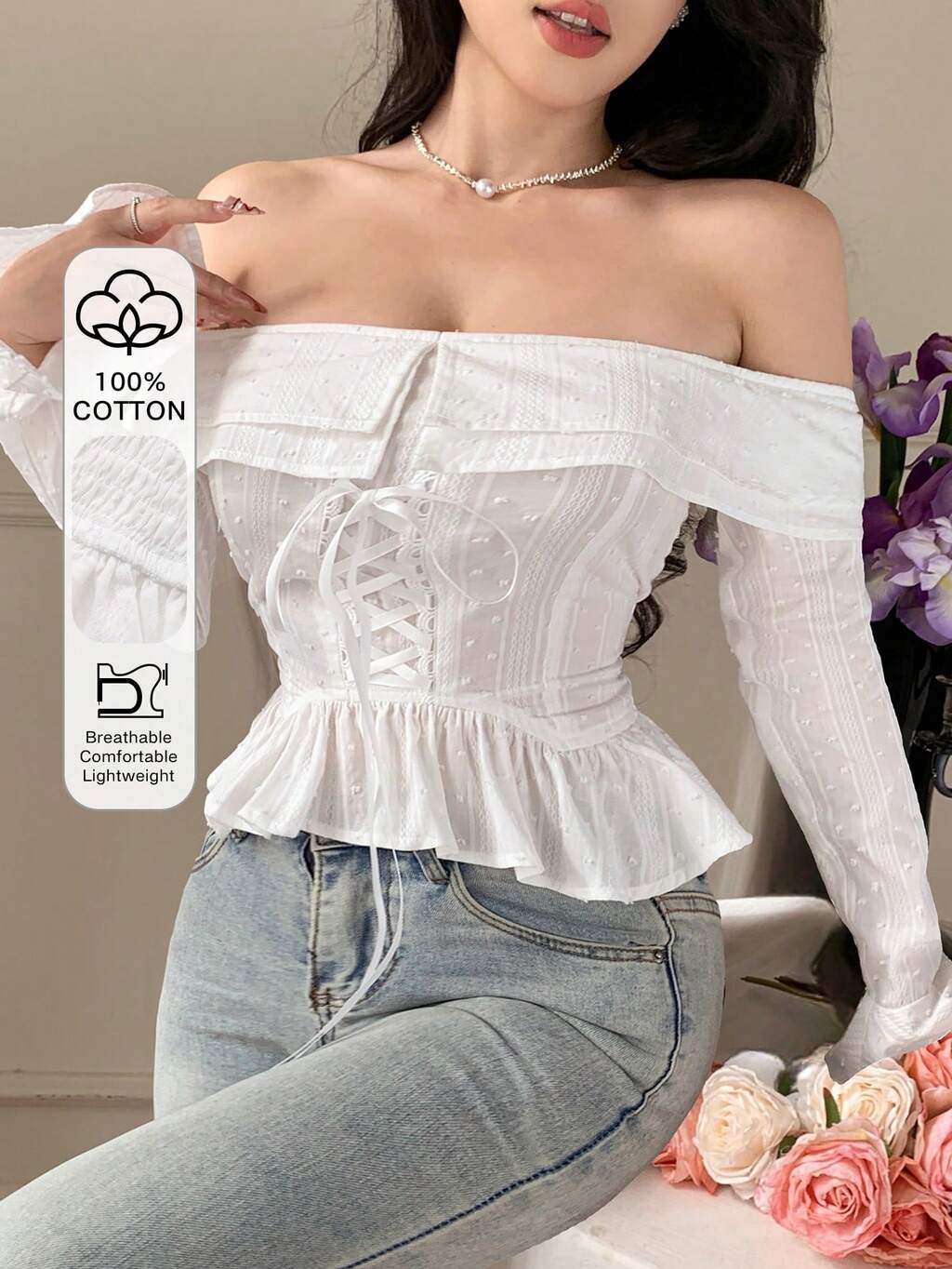 Women's Elegant Textured Off-Shoulder Ruffle Tie Flare Sleeve Blouse, Spring Summer