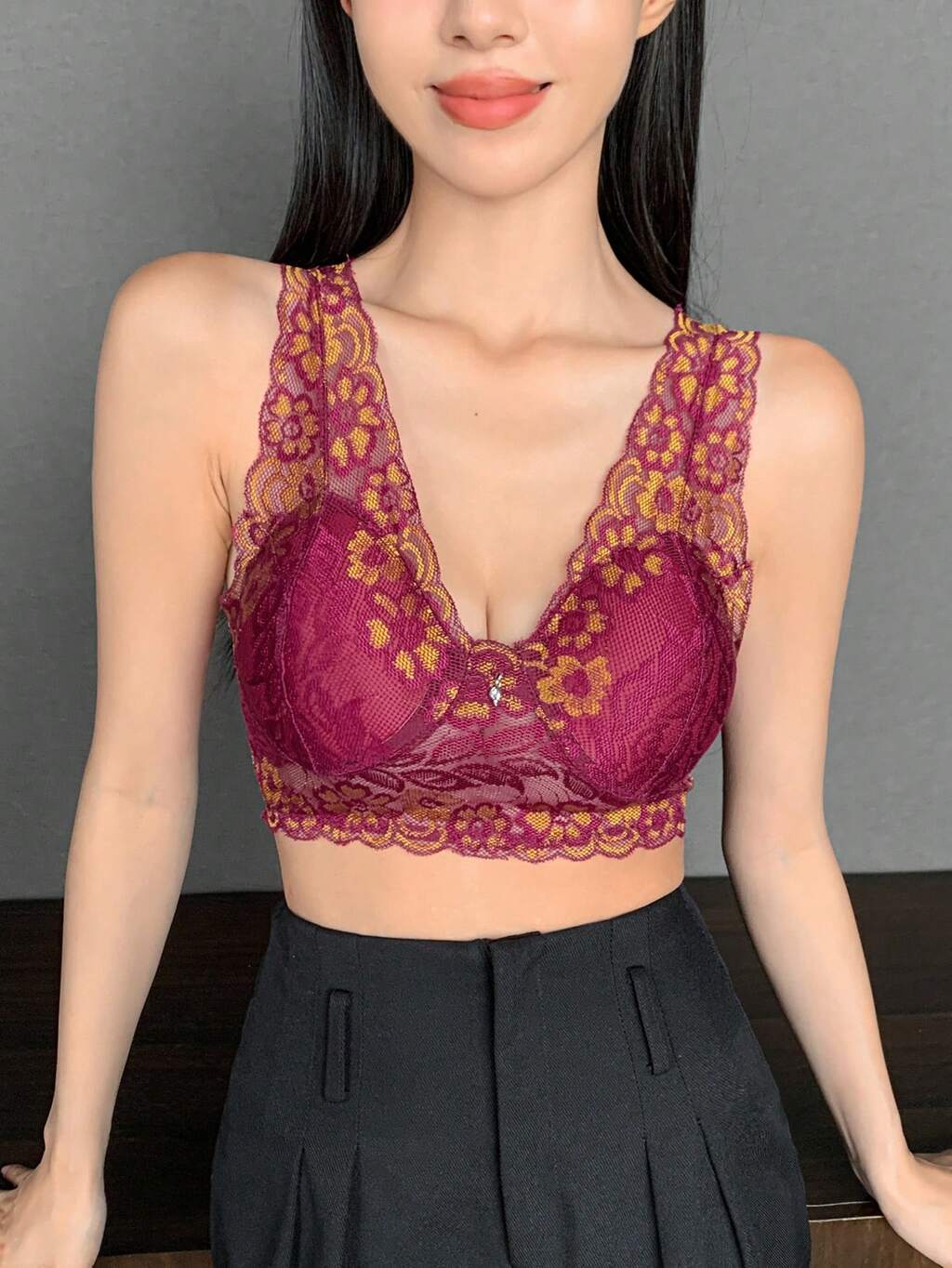 Solid Color Lace Bralette With Scalloped Edge Lingerie For Women