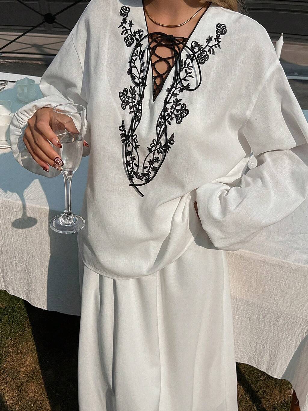 Women's Casual Vacation Style Plant Embroidery Tie V-Neck Lantern Sleeve Loose Top And Skirt 2-Piece Set, Spring/Autumn