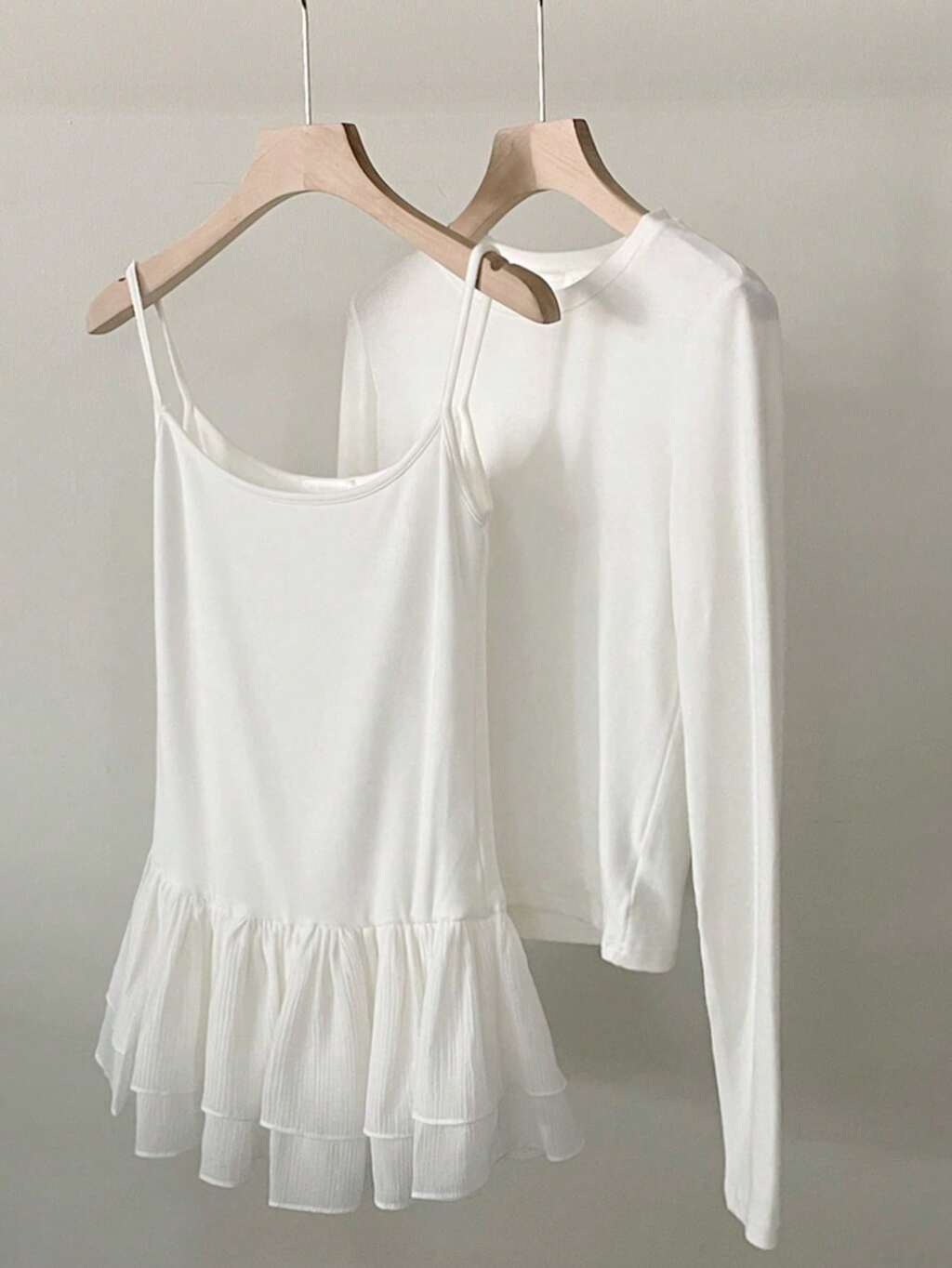 2pcs Women's Solid Color Long Sleeve Base Layer T-Shirt & Chiffon Jumper Dress Set, White, Spring/Summer