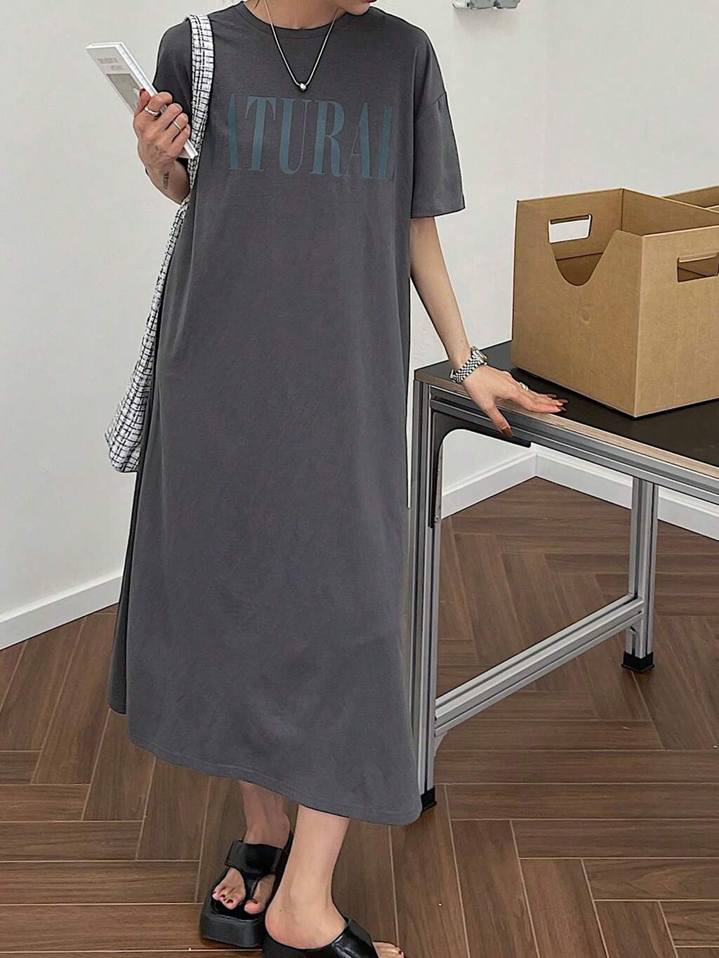Plaid Patchwork Crew Neck Midi T-Shirt Dress For Women