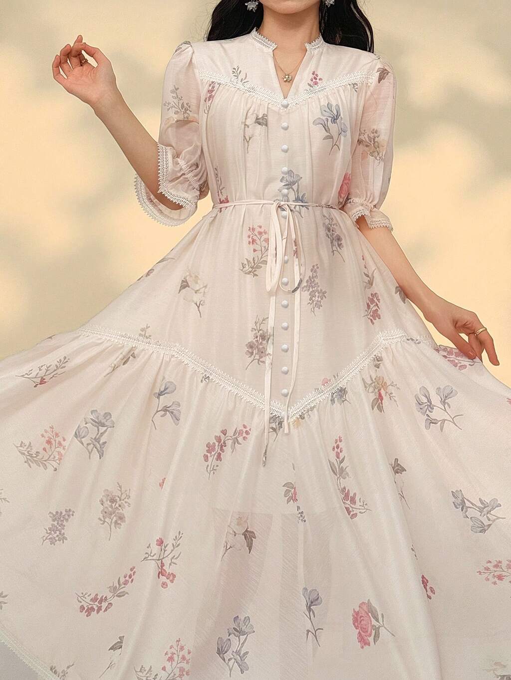 Spring & Summer Ditsy Floral Chiffon Dress, Elegant For Weddings, Parties, Formal Events, Vacation, Beach. Fitted Waist, Flared Sleeves, Tie-Up Design, Long Sleeve Sundress