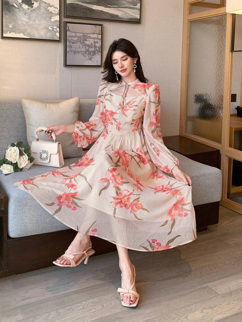 Women's Elegant Floral Print Stand Collar Puff Sleeve Midi Dress, Spring/Summer Wedding Guest Dress Sundress