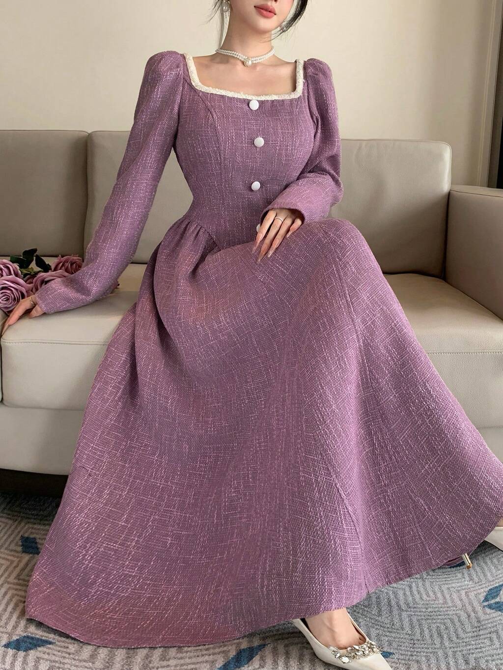 Women's Solid-Colored Square Neckline Puff Sleeve Cinching Waist Dress,Fall Dress Long Sleeve Dress