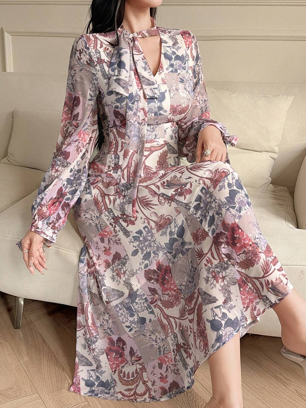 Women's Elegant Floral Print Midi Dress With Tie Collar, Spring/Summer