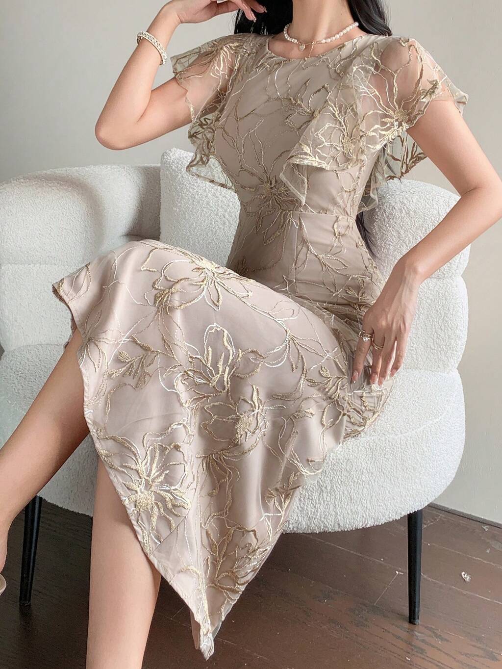 Women's Floral Embroidery Mesh Patchwork Ruffle Trim Elegant Mid-Length Dress