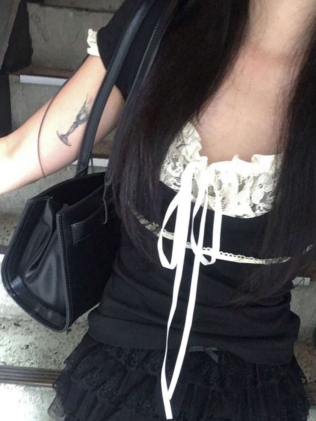 Women's T-Shirt With Lace Strap Splice, Cropped Style, Spring/Summer Delicate Lace