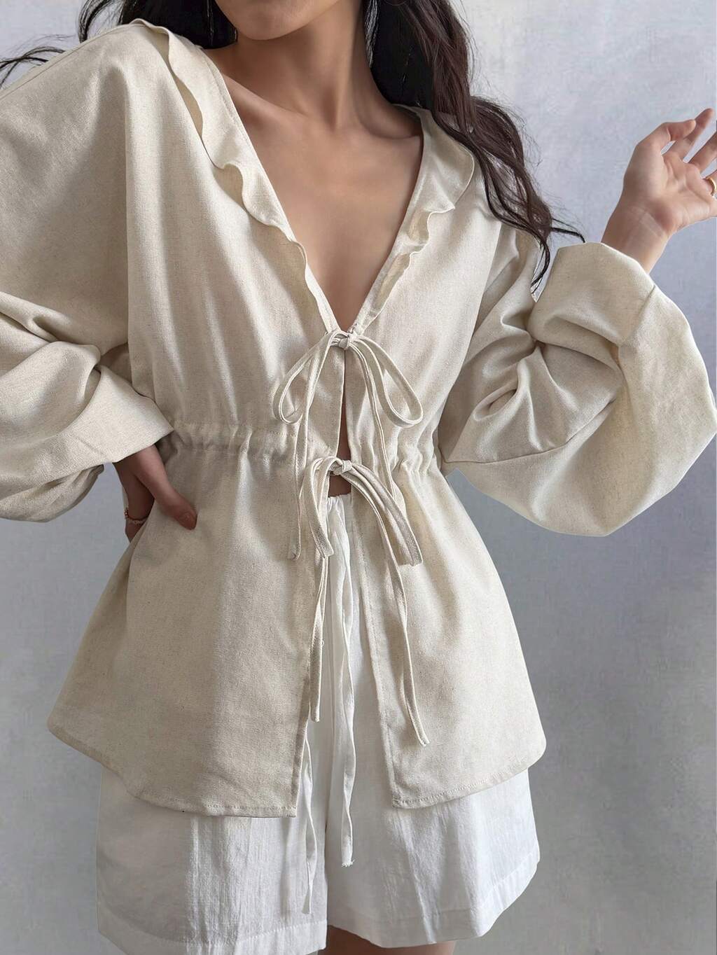 Women's Solid Color Deep V-Neck Tie Front Lantern Sleeve Long Shirt, Fashionable & Versatile