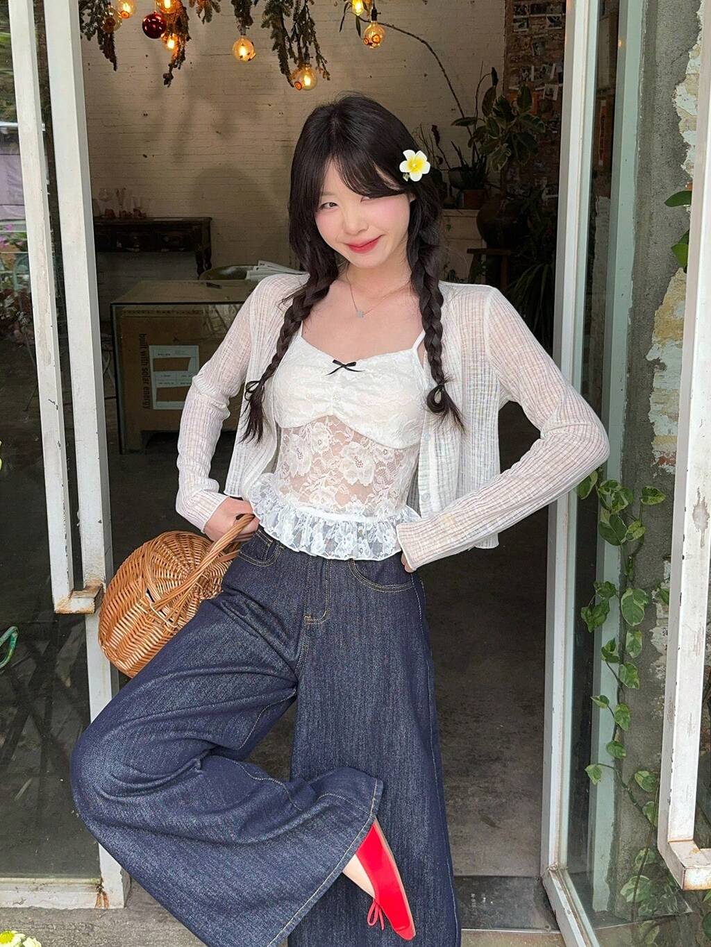 Women's French Lace Trim Korean Style Camisole And Long Sleeve Button-Up Top Set