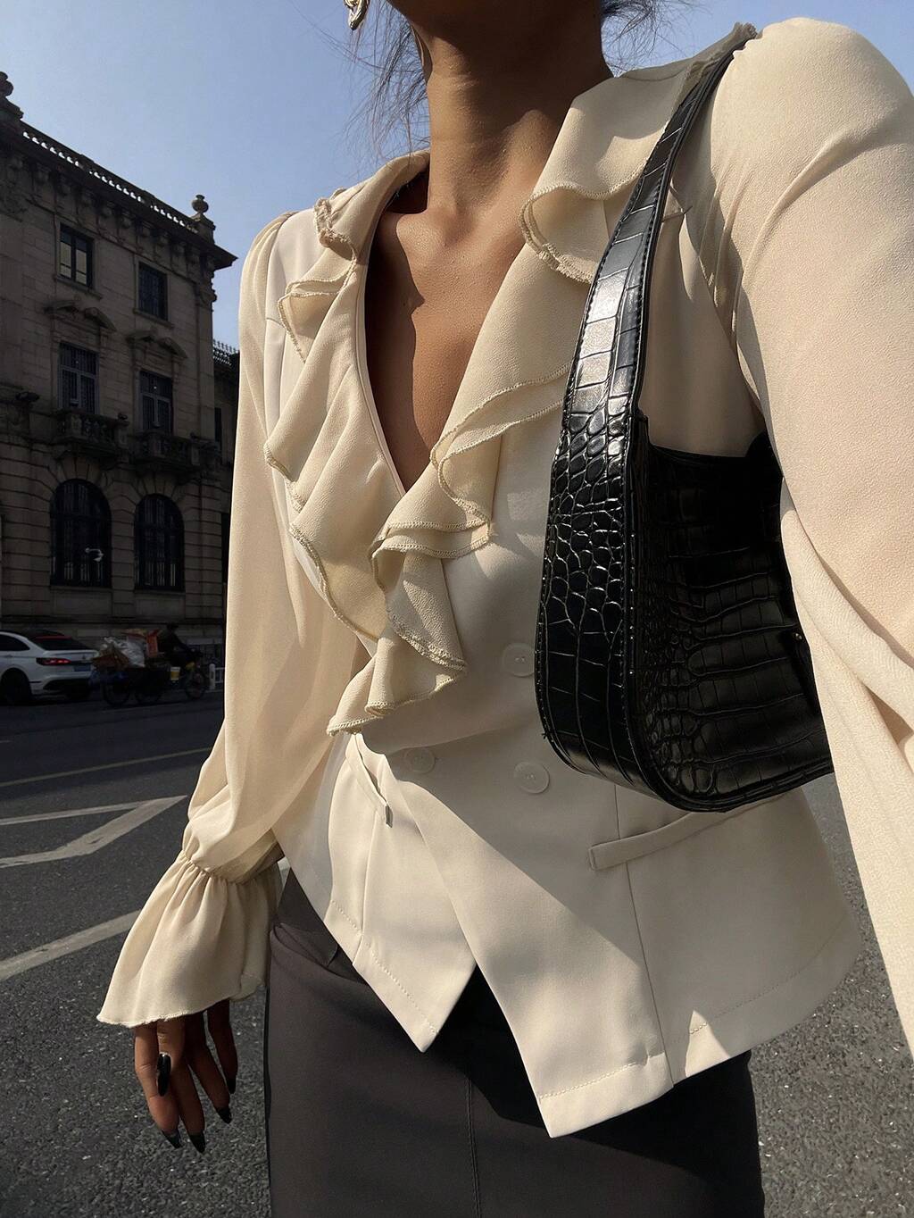 Ruffle Shoulder Long Sleeve Blouse For Women, Unique Design, Slimming & Youthful