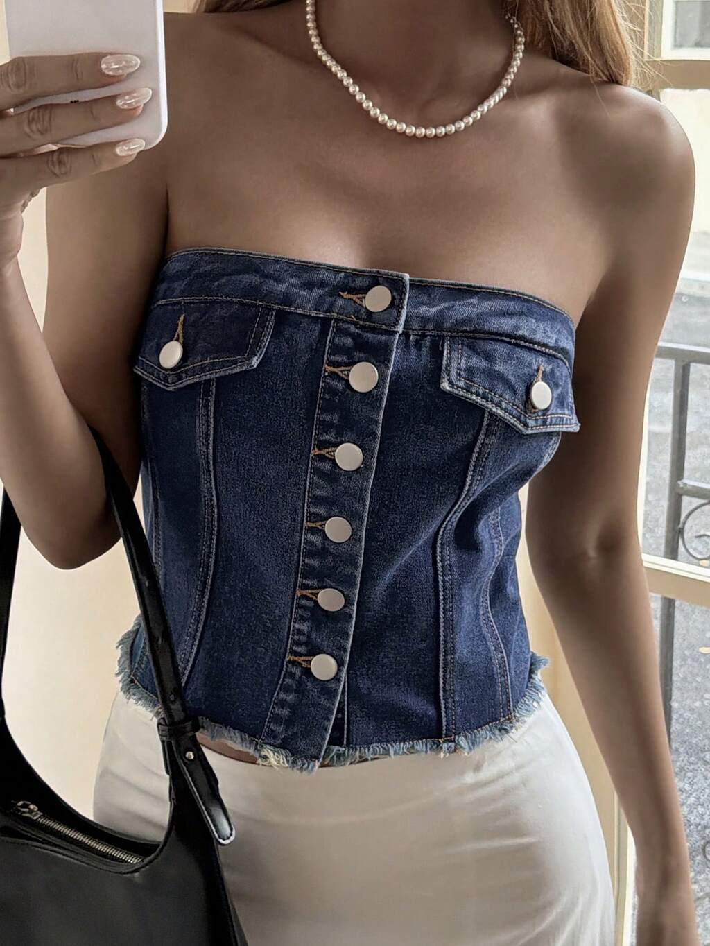 Women's Cropped Denim Vest With Large Pockets, Casual Street Style Outerwear For Spring And Summer Y2k Tube Top