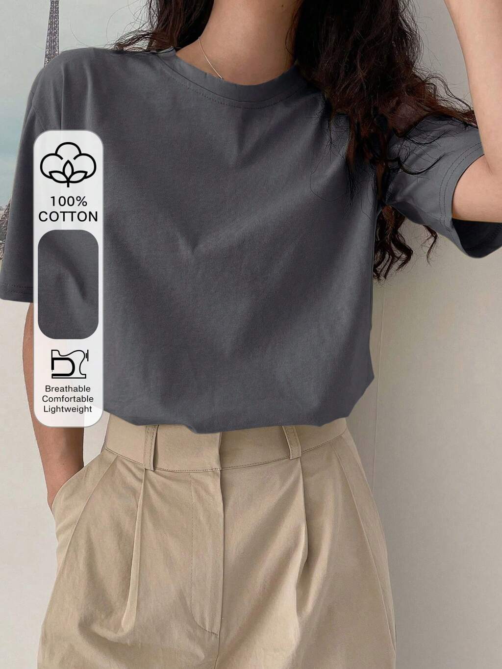 Women's Solid Color Round Neck Fashionable Short Sleeve T-Shirt, Suitable For Summer