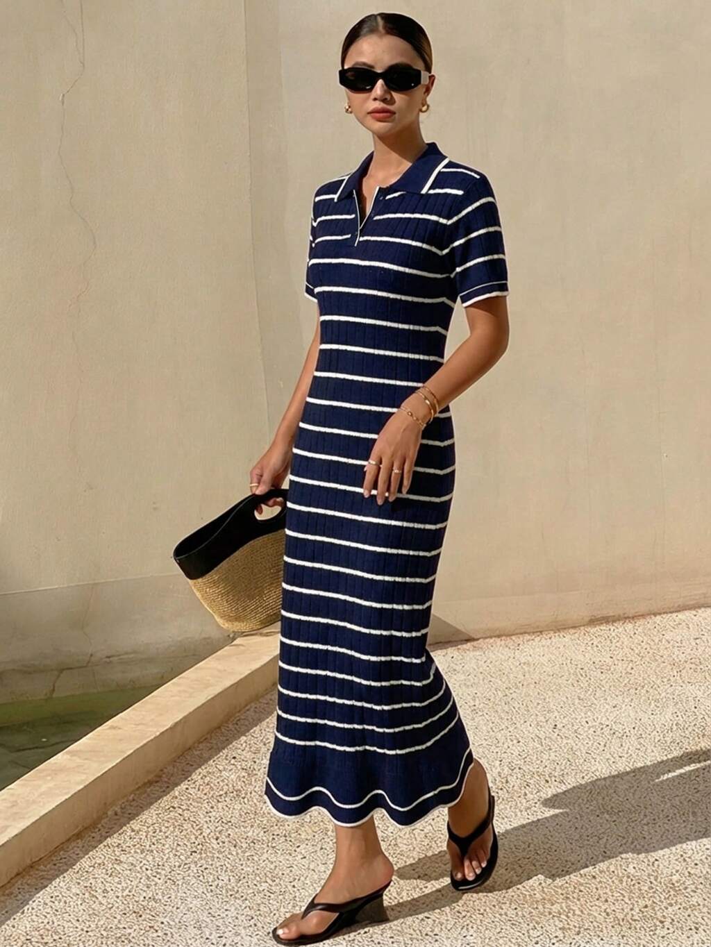 Women's Elegant Turndown Collar Colorblock Striped Knit Dress, Summer
