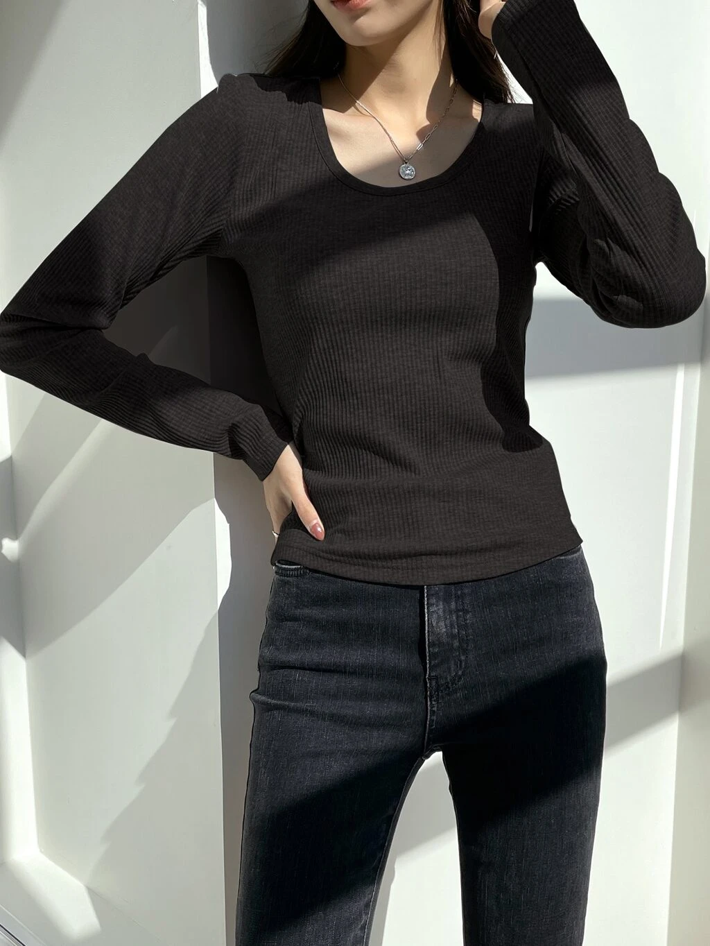 Solid Rib-Knit Tee,Fall Clothes Long Sleeve Women Tops
