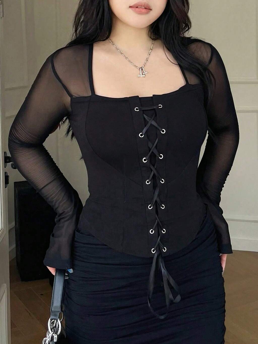 Solid Color Splice Mesh Long Sleeve Tie-Up Collar Asymmetrical Hemline Sexy Fitted Black T-Shirt