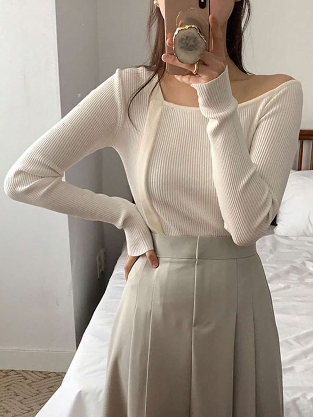 Elegancki damski sweter z odkrytymi ramionami w jednolitym kolorze, jesień